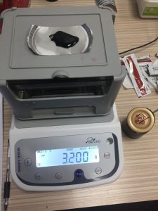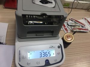 - 將2號(hào)阿膠膏體液置于稱(chēng)重臺(tái)上,屏幕出現(xiàn)空氣中阿膠液的重量為3.365,按MODE鍵,就記錄了阿膠液在空氣中的重量了。