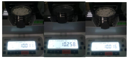 4.復(fù)位儀器,待儀器冷卻至40℃以下后,再取6.053克的氟化鈣礦粉(A3樣品)均勻鋪在樣品盤上,重復(fù)上述測(cè)試步驟;測(cè)試結(jié)束后得出第二組數(shù)據(jù),顯示樣品的水分含量為10.260%;