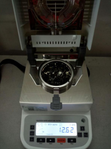 - 為了得到更精確穩(wěn)定的數(shù)據(jù)結(jié)果,在進行第二次測試過程前先等待種子水分儀降溫,待水分儀本身冷卻至40度以下時,同樣取5克種子顆粒于不銹鋼托盤中,將種子顆粒平鋪均勻,這次我們把溫度設定在135℃,按“START”鍵開始測試,18分54秒后檢測結(jié)束,檢測數(shù)據(jù)顯示12.62%;