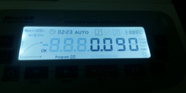 測(cè)試樣品1:為了檢測(cè)儀器的精確性,待儀器溫度降至30℃(常溫)以下時(shí)進(jìn)行第二次測(cè)量,用藥匙取樣10-12g,用藥匙取樣10-12g纖維紙上,溫度設(shè)置85℃用儀器進(jìn)行加熱,約3分鐘后檢測(cè)結(jié)束,檢測(cè)數(shù)據(jù)顯示0.090%;