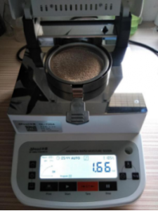 一、測(cè)試咖啡:為了使測(cè)試過程中咖啡水分儀將咖啡烘干烘透,我們將咖啡分散開來,以便溫度能滲透進(jìn)咖啡內(nèi)部。取5克咖啡撒于不銹鋼托盤中,用鑷子將咖啡平鋪均勻,為避免咖啡經(jīng)過高溫度加熱后變性,我們將溫度設(shè)置在105℃,按“START”鍵開始測(cè)試,5分44秒后檢測(cè)結(jié)束,檢測(cè)數(shù)據(jù)顯示1.66%;