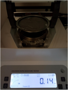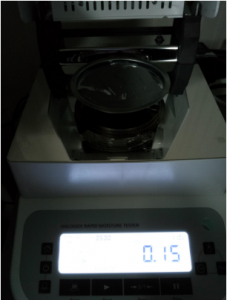 第一次,因樣品3屬金屬粉末,密度較大,取10克樣品3#粉末,置于不銹鋼托盤中,用鑷子將金屬粉末平鋪均勻,溫度設(shè)置110℃用儀器進行加熱,定時5分鐘后檢測結(jié)束,檢測數(shù)據(jù)顯示0.15%;