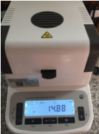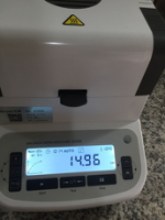 測試樣品2:為了檢測儀器的精確性,待儀器溫度降至50℃以下時進行第二次測試,用實驗勺提取5.5克飼料,置于不銹鋼托盤中,用實驗藥勺將飼料平鋪均勻,溫度設(shè)置135℃用儀器進行加熱,約15分鐘后檢測結(jié)束,檢測數(shù)據(jù)顯示14.88%;