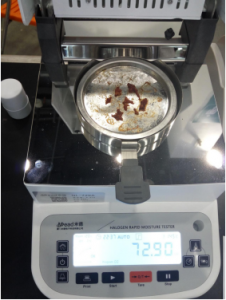 用鑷子提取2.2克牛肉肉末,置于不銹鋼托盤中,用鑷子將牛肉肉末平鋪均勻,溫度設置145℃用儀器進行加熱,檢測結束,檢測數(shù)據(jù)顯示71.16%;為了檢測儀器的精確性,待儀器溫度降至50℃以下時進行第二次測量,用實驗勺提取2.2克牛肉,置于不銹鋼托盤中,用實驗勺將面粉平鋪均勻,溫度設置150℃用儀器進行加熱,檢測結束,檢測數(shù)據(jù)顯示71.85%;