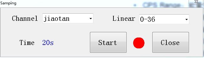 首先選中需要標(biāo)定的通道和線性。如上圖4.3所示:通道為選擇jiaotan(根據(jù)現(xiàn)場可以選擇新建的通道)?;然后選擇線性為:0-36(根據(jù)實(shí)際情況選擇);點(diǎn)Start按鈕,開始啟動取樣。啟動后指示燈變?yōu)榫G色,Time 為采樣倒計(jì)時,當(dāng)此數(shù)據(jù)為0時表示取樣完成。最后點(diǎn)Close關(guān)閉窗體按鈕完成取樣。